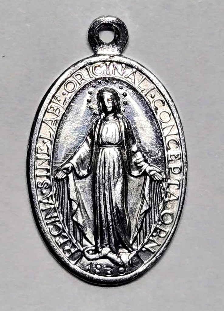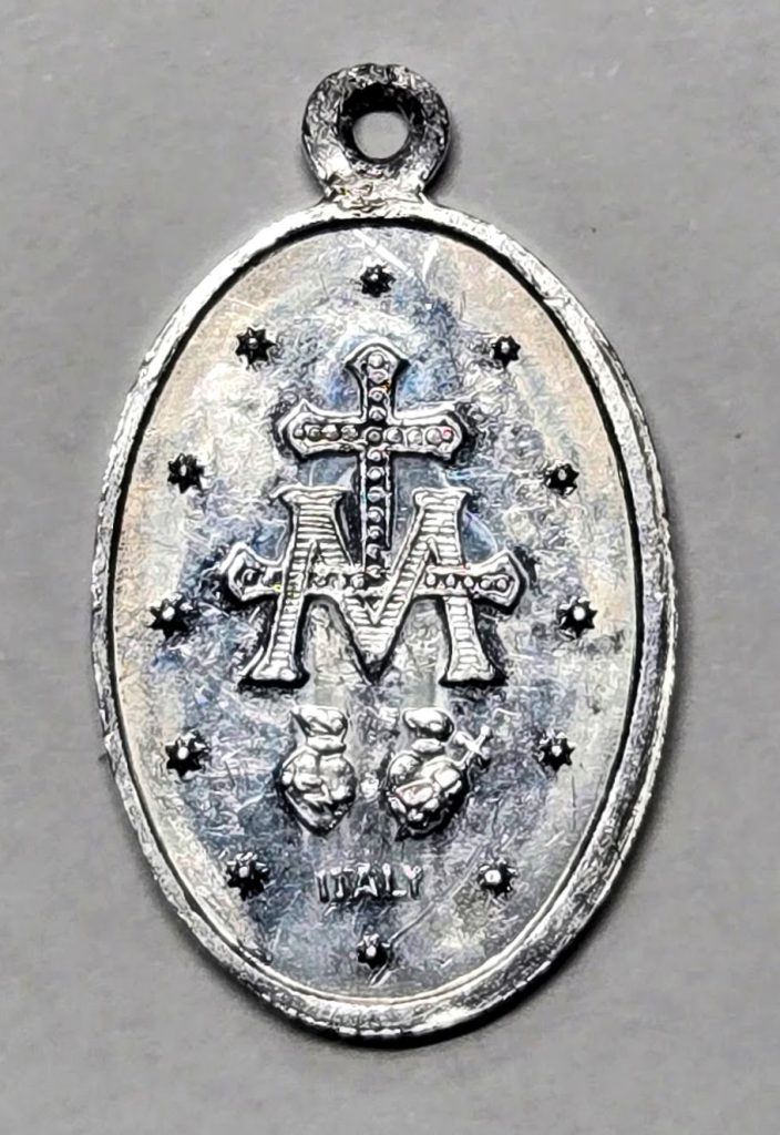 「不思議なメダイ」(または奇跡のメダル。メダイはフランス語)は、1830年にフランスの修道女カトリーヌ・ラブレが、祈りの中で聖母マリアの姿を見たことをもとに作られたペンダントトップ(メダル)です。多くの場合、金属製で、縦2〜3センチほどの楕円形をしています。表には聖母マリアが立っている姿が描かれ、裏にはマリアをあらわす「M」と十字架、そして2つのハートが描かれた独特のデザインになっています。
